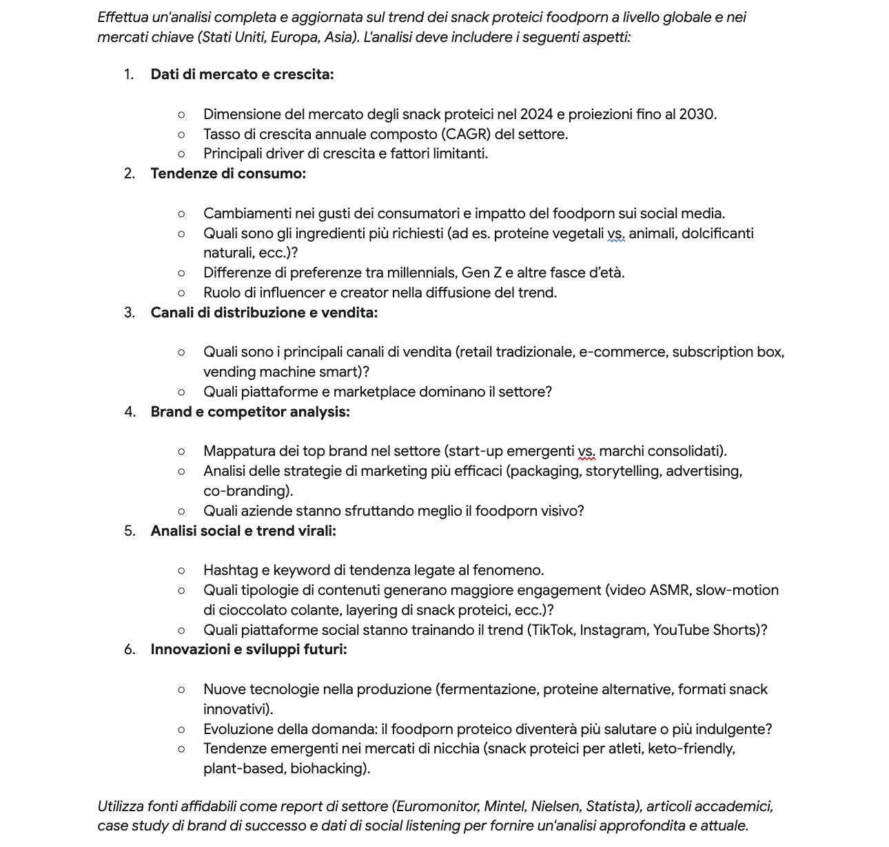 Gemini has dug into the numbers. It found data on sales, CAGR, and growth forecasts. But the most interesting part is something else: it connected all of this with social trends, showing how TikTok and Instagram have transformed the concept of “protein snacks” from a functional necessity to an aesthetic fetish. The slow-motion of melting chocolate, the perfect sound of a bar breaking, the cream that melts under your teeth: these details sell more than the ingredient list on the back of the package.